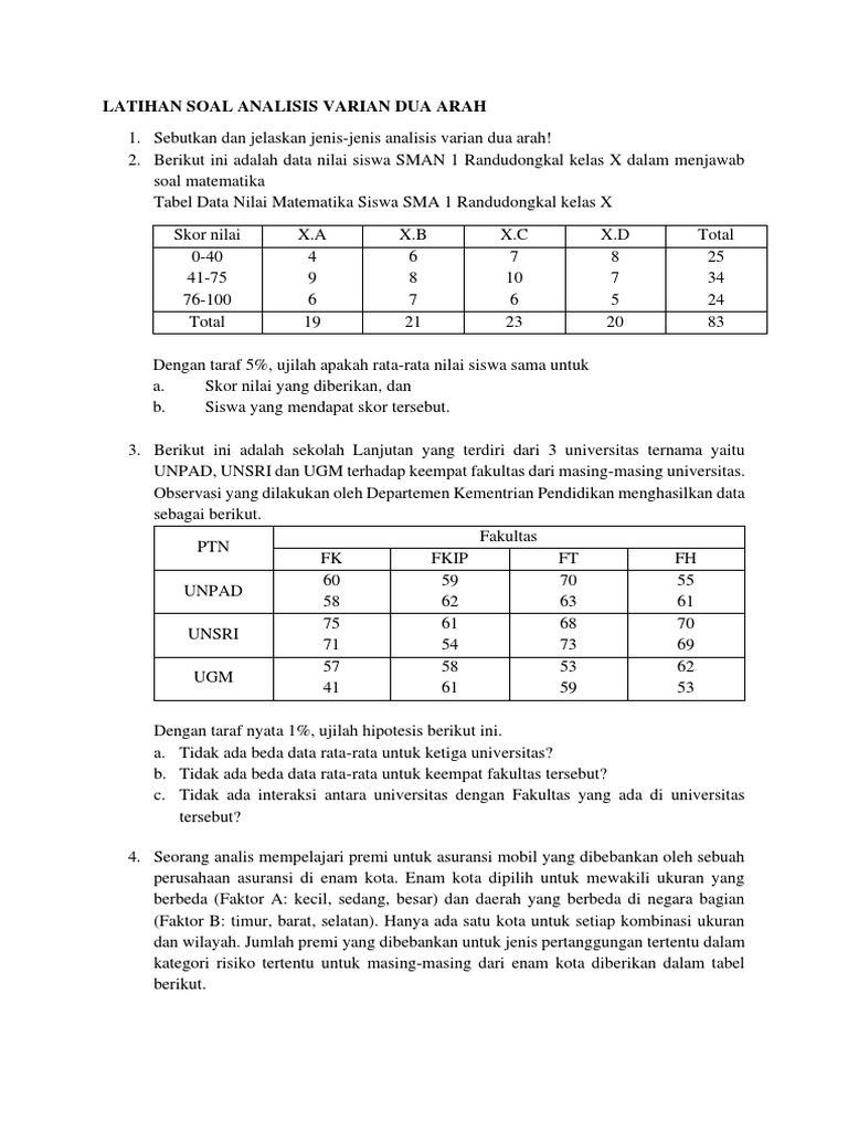 Analisis varian (ANOVA) adalah metode statistik yang digunakan untuk membandingkan rata-rata dari dua atau lebih kelompok. ANOVA sangat berguna dalam eksperimen di mana kita ingin mengetahui apakah perlakuan yang berbeda memiliki efek yang signifikan terhadap variabel dependen. Dalam konteks ini, kita akan membahas contoh soal analisis varian yang melibatkan dua kelas atau kelompok, dengan fokus pada pemahaman konsep dan penerapan perhitungan secara manual.