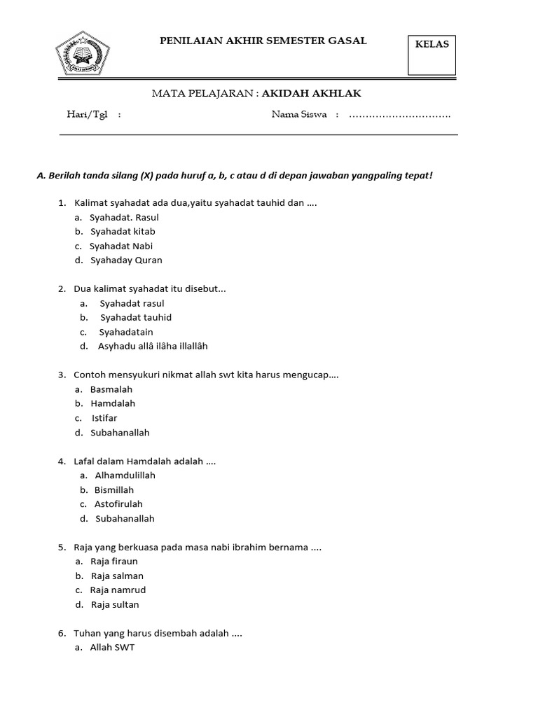 Artikel ini diharapkan dapat membantu guru dan siswa dalam mempersiapkan dan menghadapi ujian Aqidah Akhlak kelas 1 MI semester 2. Soal-soal ini mencakup materi tentang Rukun Iman, Rukun Islam, Akhlak Terpuji, Akhlak Tercela, Kisah Nabi dan Rasul, serta penerapannya dalam kehidupan sehari-hari. Dengan mempelajari soal-soal ini, siswa diharapkan dapat memahami dan mengamalkan ajaran Islam dengan baik.