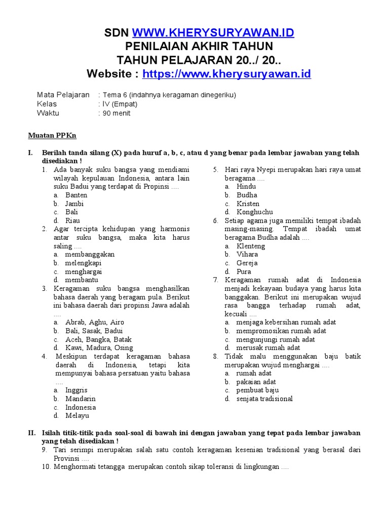 Bagian ini akan menguji pemahaman siswa mengenai keberagaman suku bangsa dan budaya yang ada di Indonesia. Siswa akan dihadapkan pada soal-soal yang mengharuskan mereka untuk mengidentifikasi, membandingkan, dan menjelaskan ciri khas dari berbagai suku bangsa serta bentuk-bentuk keragaman budaya.